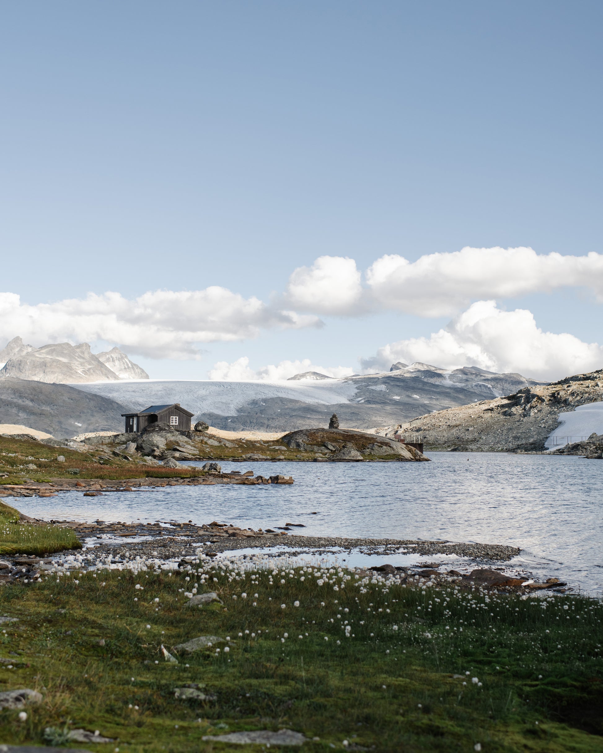 A quiet cabin rests beneath the glacier’s edge, surrounded by water, sky, and open air—Norway in its purest form.